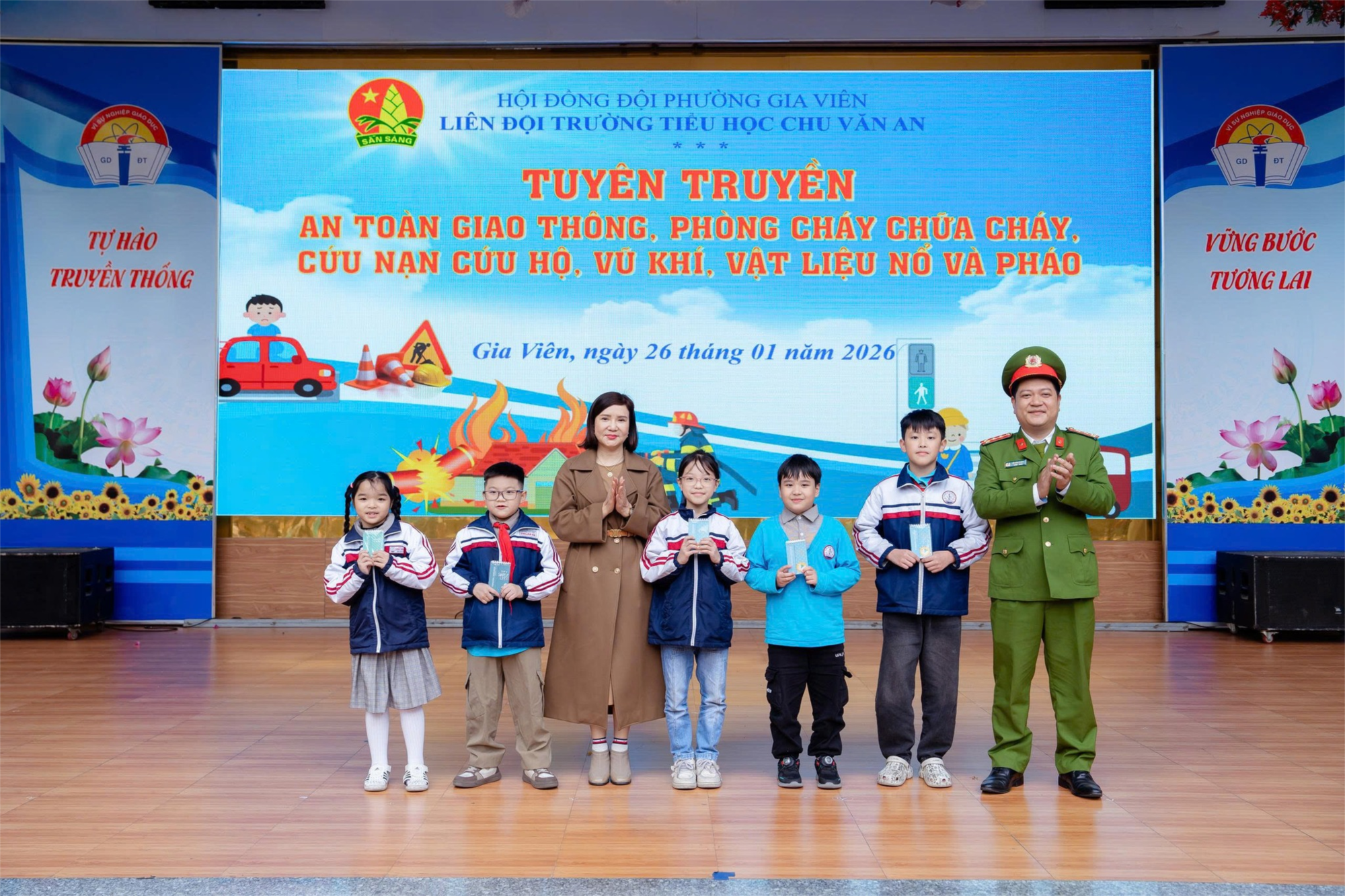 Nhằm nâng cao nhận thức, trang bị kiến thức và kỹ năng cần thiết cho cán bộ, giáo viên, nhân viên và học sinh trong công tác đảm bảo an toàn trường học; Sáng ngày 27/01/2026, Trường Tiểu học Chu Văn An phối hợp với công an phường Gia Viên tổ chức buổi " TUYÊN TRUYỀN AN TOÀN GIAO THÔNG - PHÒNG CHÁY CHỮA CHÁY - CỨU NẠN CỨU HỘ , VŨ KHÍ, VẬT LIỆU NỔ VÀ PHÁO " , Năm học 2025 - 2026
