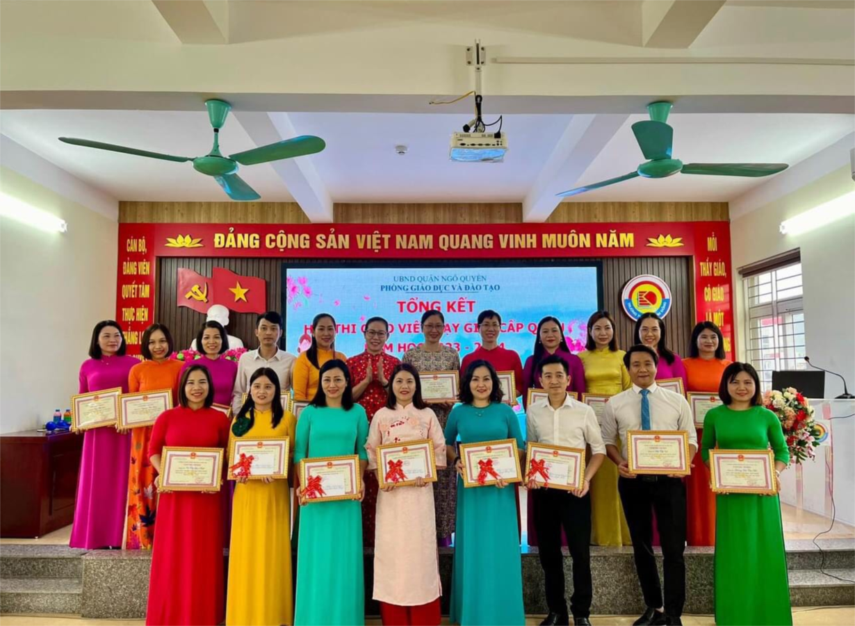 Chiều ngày 01/12/2023, tại trường Tiểu học Kim Đồng, Phòng Giáo dục và Đào tạo quận Ngô Quyền đã tổ chức Tổng kết Hội thi giáo viên giỏi cấp quận năm học 2023 - 2024. Trường Tiểu học Chu Văn An có 03/20 giáo viên tham gia hội thi: cô giáo Đặng Thị Bích Thuỷ giảng dạy môn Tiếng Anh, cô giáo Trần Thị Thi, Nguyễn Thị Thu Hường giảng dạy môn Âm nhạc. Xin chúc mừng cả 03 đồng chí giáo viên đều được công nhận danh hiệu Giáo viên dạy giỏi cấp quận. Đặc biệt, cô giáo Đặng Thị Bích Thuỷ với điểm thực hành tiết dạy đạt loại Giỏi, điểm trình bày báo cáo biện pháp nâng cao chất lượng giáo dục đạt loại Giỏi đã được lãnh đạo Phòng GD&ĐT biểu dương, khen thưởng trong chương trình Tổng kết hội thi. Đây là niềm vui, niềm tự hào của nhà trường đồng thời cũng là nguồn động lực để các thầy cô giáo tiếp tục nỗ lực phấn đấu, quyết tâm hoàn thành xuất sắc nhiệm vụ năm học 2023 - 2024.