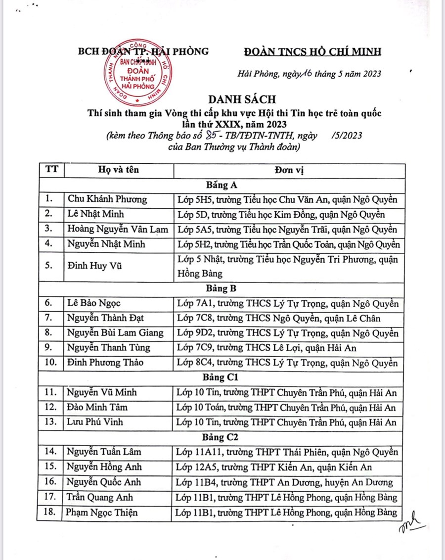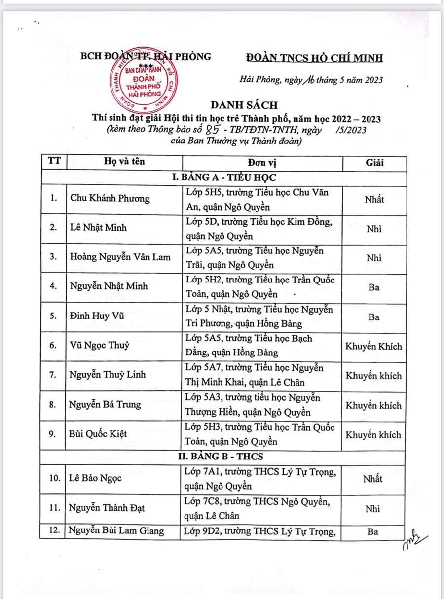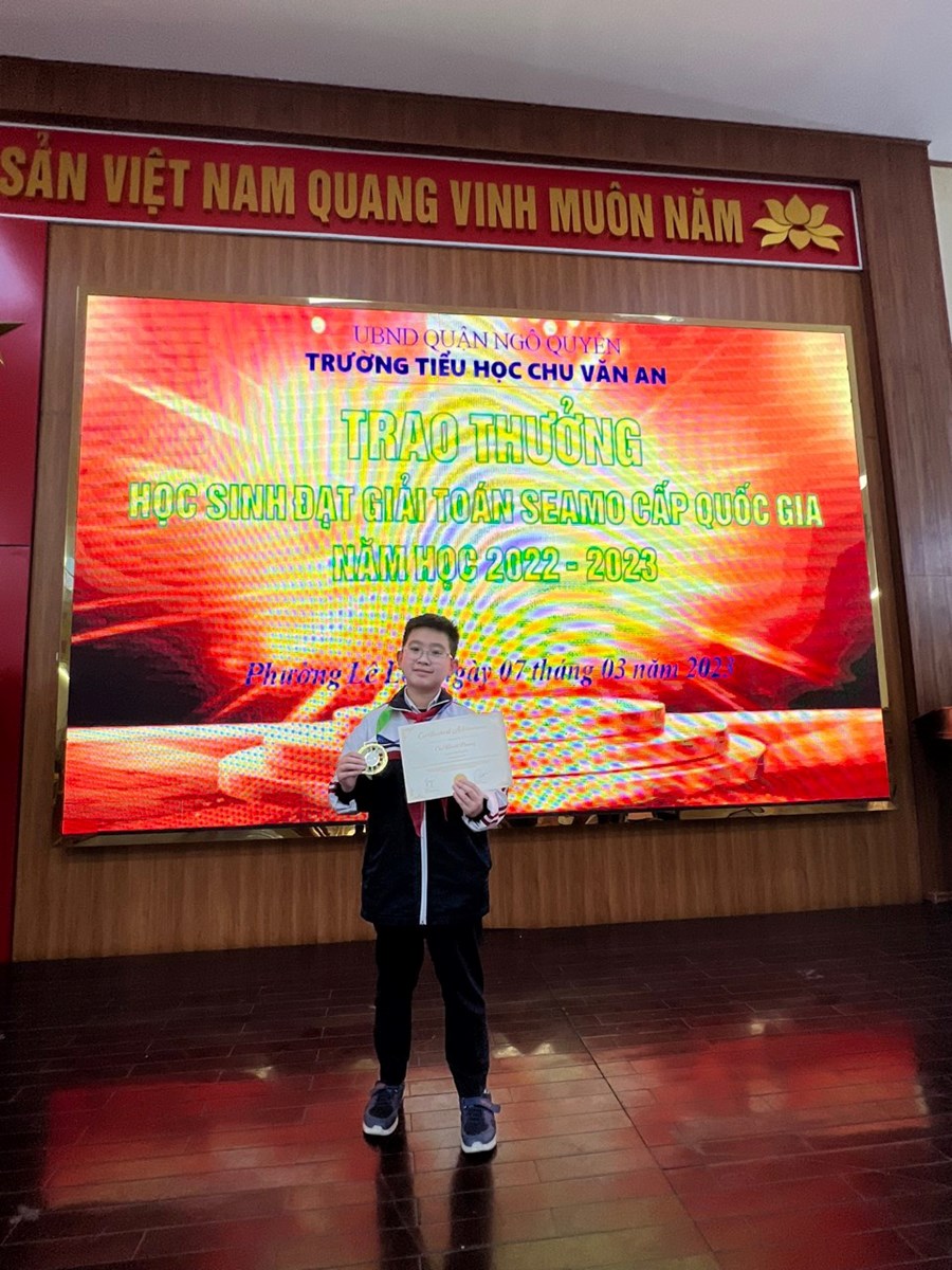Nhà trường xin chúc mừng và biểu dương em Chu Khánh Phương Chi đội lớp 5H5 đã xuất sắc đạt giải nhất hội thi Tin học trẻ cấp Thành phố năm học 2022 – 2023 và Khánh Phương cũng là một trong năm thí sinh tham gia vòng thi cấp khu vực Hội thi Tin học trẻ toàn quốc lần thứ XXIX, năm 2023.