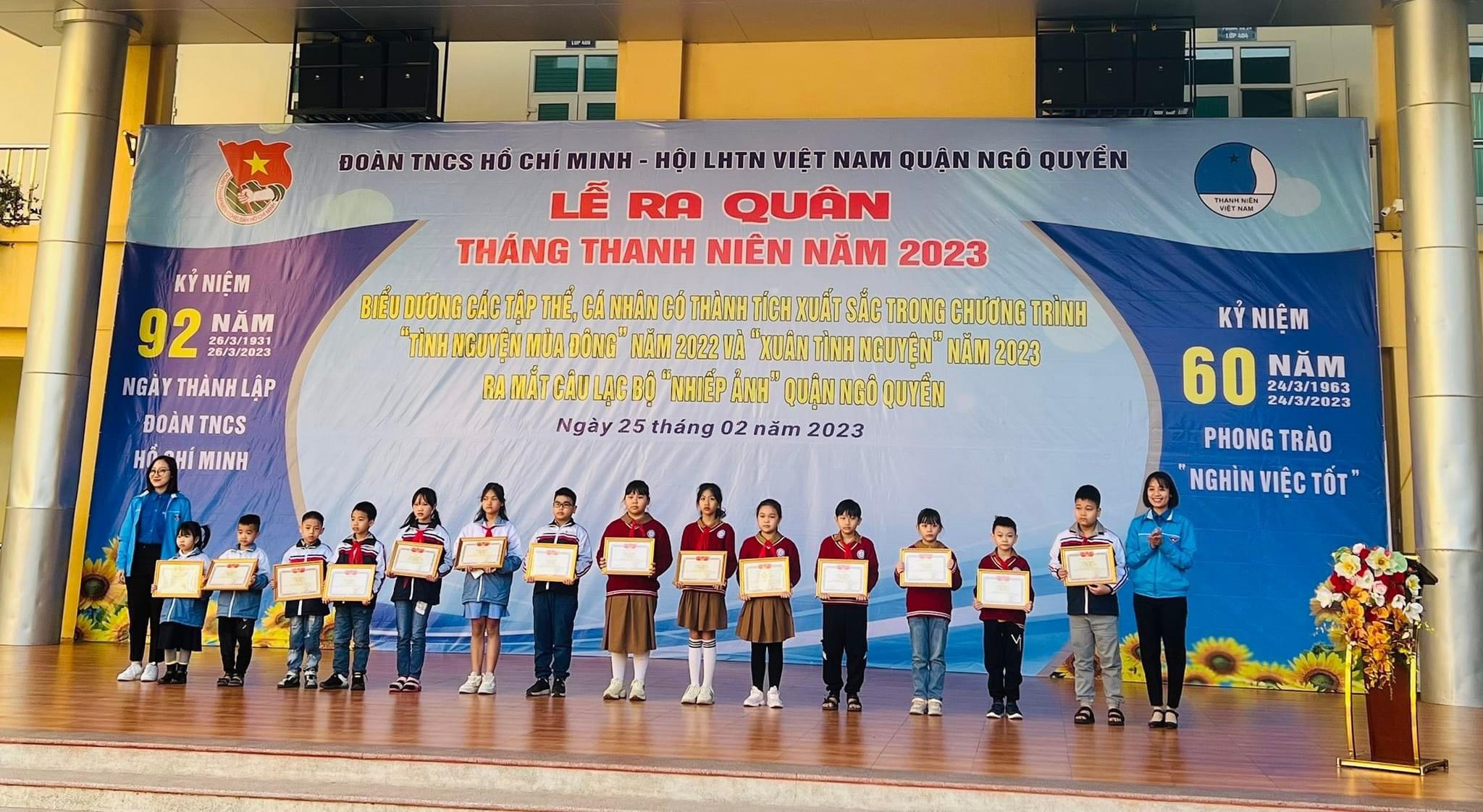 Sáng ngày 25/02/2023, tại trường Tiểu học Chu Văn An, Ban Thường vụ Đoàn Quận Ngô Quyền tổ chức Lễ khởi động Tháng Thanh niên; Biểu dương các tập thể, cá nhân có thành tích xuất sắc trong Chương trình “Tình nguyện mùa đông” năm 2022 và “Xuân tình nguyện” năm 2023; Ra mắt Câu lạc bộ “Nhiếp ảnh” Quận Ngô Quyền, hướng tới chào mừng kỷ niệm 92 năm ngày thành lập Đoàn TNCS Hồ Chí Minh (26/3/1931 – 26/3/2023) và chào mừng 60 năm phong trào nghìn việc tốt.