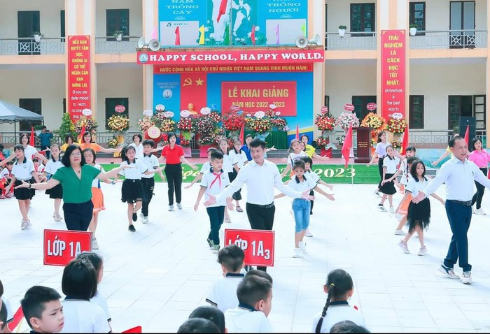 Thầy Hiệu trưởng và các thầy cô giáo, các em học sinh cùng hoà vào âm nhạc, tập dân vũ cùng nhau. Ảnh: NVCC