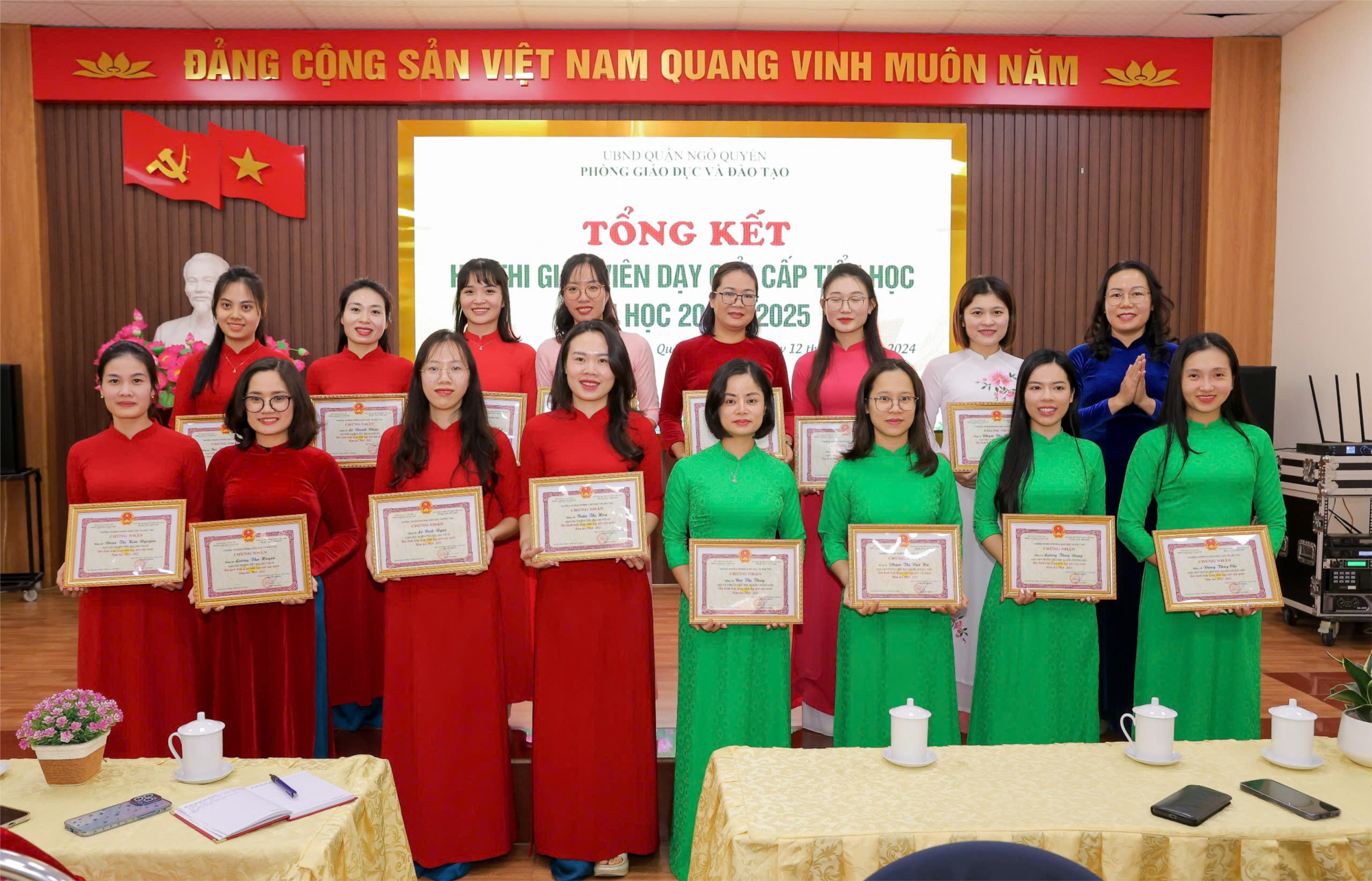 Tham gia Hội thi, mỗi thầy cô giáo đã thực hành 01 tiết dạy và báo cáo 01 biện pháp nâng cao chất lượng giảng dạy đã được áp dụng có hiệu quả trong thực tế. Trường Tiểu học Chu Văn An vinh dự khi có Cô giáo Đoàn Thị Bích Ngọc - GVCN lớp 1A9- đã xuất sắc được Trưởng phòng Phòng GD&ĐT Quận Ngô Quyền tặng Giấy khen và biểu dương tại buổi Tổng kết vì có thành tích vượt trội ở cả hai nội dung thi. Xin chúc mừng và nhiệt liệt biểu dương 06 cô giáo của nhà trường đã thể hiện tốt các nội dung thi và được công nhận giáo viên dạy giỏi cấp Quận năm học 2024-2025: