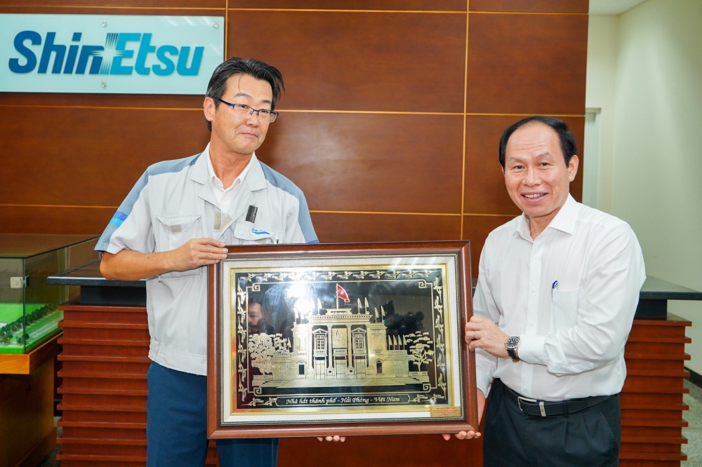 Đồng chí Bí thư Thành ủy tặng quà cho Công ty TNHH Vật liệu Nam Châm Shin-Etsu Việt Nam.