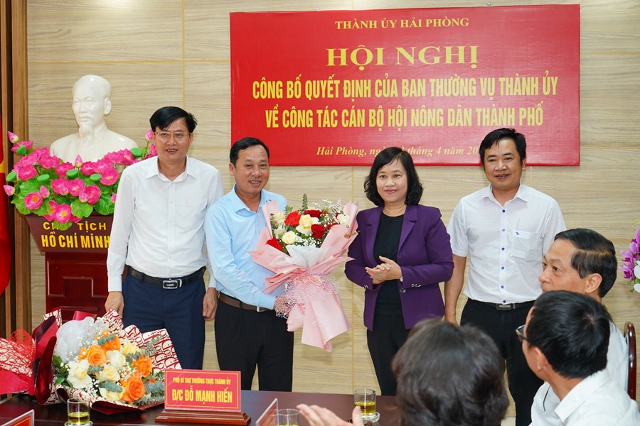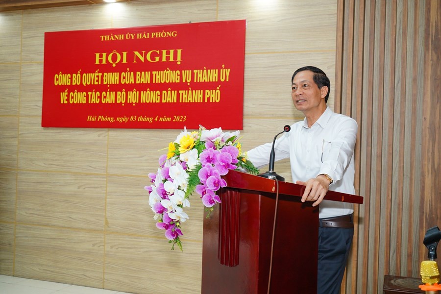 (Haiphong.gov.vn) - Sáng 3/4, Thường trực Thành ủy tổ chức Hội nghị công bố Quyết định của Ban Thường vụ Thành ủy về công tác cán bộ Hội Nông dân thành phố. Đồng chí Đỗ Mạnh Hiến, Phó Bí thư Thường trực Thành ủy chủ trì Hội nghị. Cùng dự có đồng chí Đào Trọng Đức, Ủy viên Ban Thường vụ Thành ủy, Trưởng Ban Tổ chức Thành ủy.