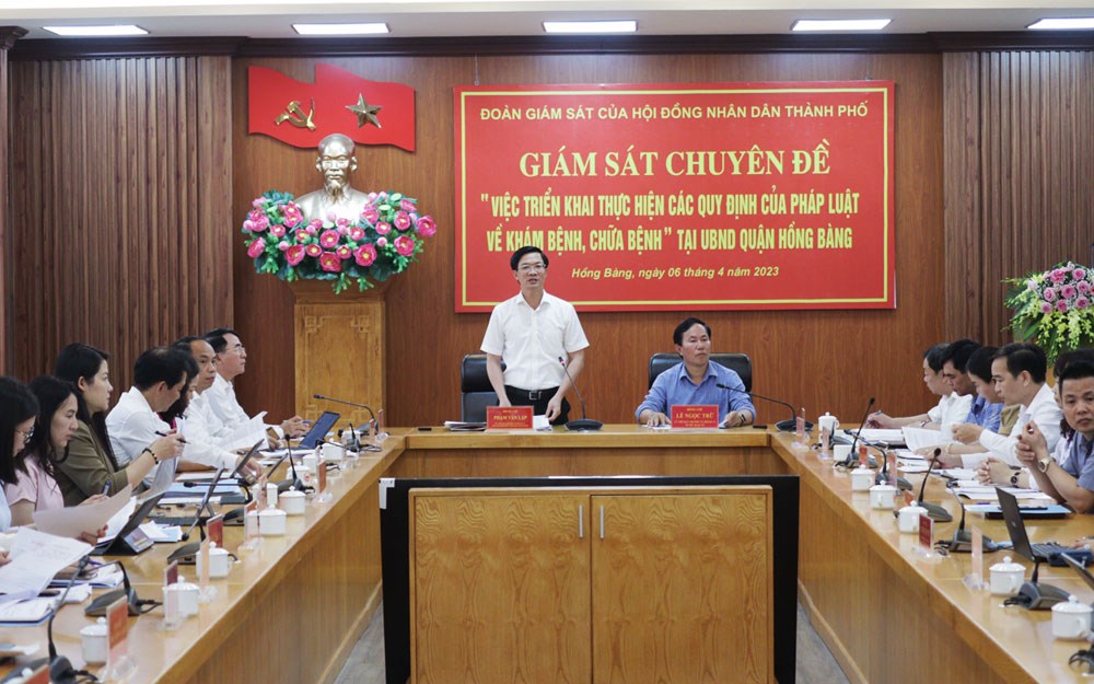 (Haiphong.gov.vn) - Sáng 6/4, Đoàn giám sát Chuyên đề của HĐND thành phố do đồng chí Phạm Văn Lập, Chủ tịch HĐND thành phố làm Trưởng đoàn giám sát việc triển khai thực hiện các quy định của pháp luật về khám bệnh, chữa bệnh tại UBND quận Hồng Bàng. Dự cuộc làm việc có đồng chí Lê Khắc Nam, Phó Chủ tịch UBND thành phố; cùng đại diện lãnh đạo các Sở, ngành, đơn vị liên quan.
