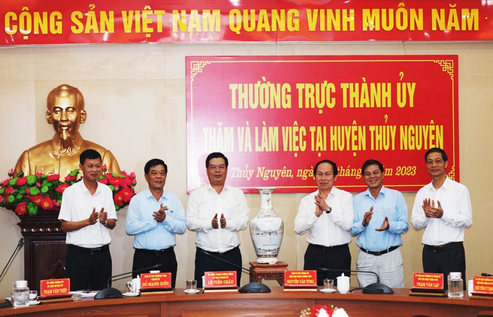 Qua nghe báo cáo và ý kiến của các đại biểu, phát biểu kết luận cuộc làm việc, đồng chí Lê Tiến Châu, Bí thư Thành ủy ghi nhận và đánh giá cao những kết quả Đảng bộ, chính quyền và Nhân dân huyện Thủy Nguyên đạt được khá toàn diện trên các lĩnh vực: xây dựng Đảng, hệ thống chính trị, vận động người dân; xây dựng nông thôn mới, cải cách hành chính, chuyển đổi số... cho thấy quyết tâm của huyện trong phát triển kinh tế - xã hội, nâng cao đời sống vật chất, tinh thần của người dân.