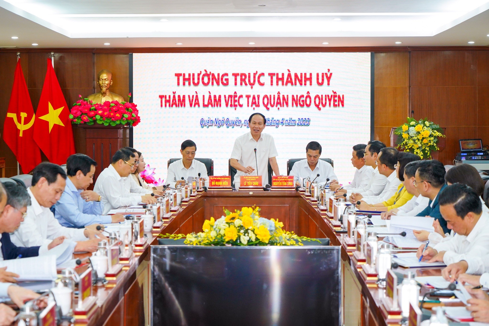 (Haiphong.gov.vn) - Chiều 10/4, Thường trực Thành ủy làm việc với Ban Chấp hành Đảng bộ quận Ngô Quyền về kết quả triển khai thực hiện Nghị quyết Đại hội Đảng các cấp, nhiệm kỳ 2020 - 2025. Các đồng chí: Lê Tiến Châu, Ủy viên Trung ương Đảng, Bí thư Thành ủy; Nguyễn Văn Tùng, Phó Bí thư Thành ủy, Chủ tịch UBND thành phố; Đỗ Mạnh Hiến, Phó Bí thư Thường trực Thành ủy đồng chủ trì cuộc làm việc. Dự cuộc làm việc có các đồng chí Ủy viên Ban Thường vụ Thành ủy: Đào Khánh Hà, Trưởng Ban Tuyên giáo Thành ủy; Đào Trọng Đức, Trưởng Ban Tổ chức Thành ủy và lãnh đạo các sở, ngành liên quan.