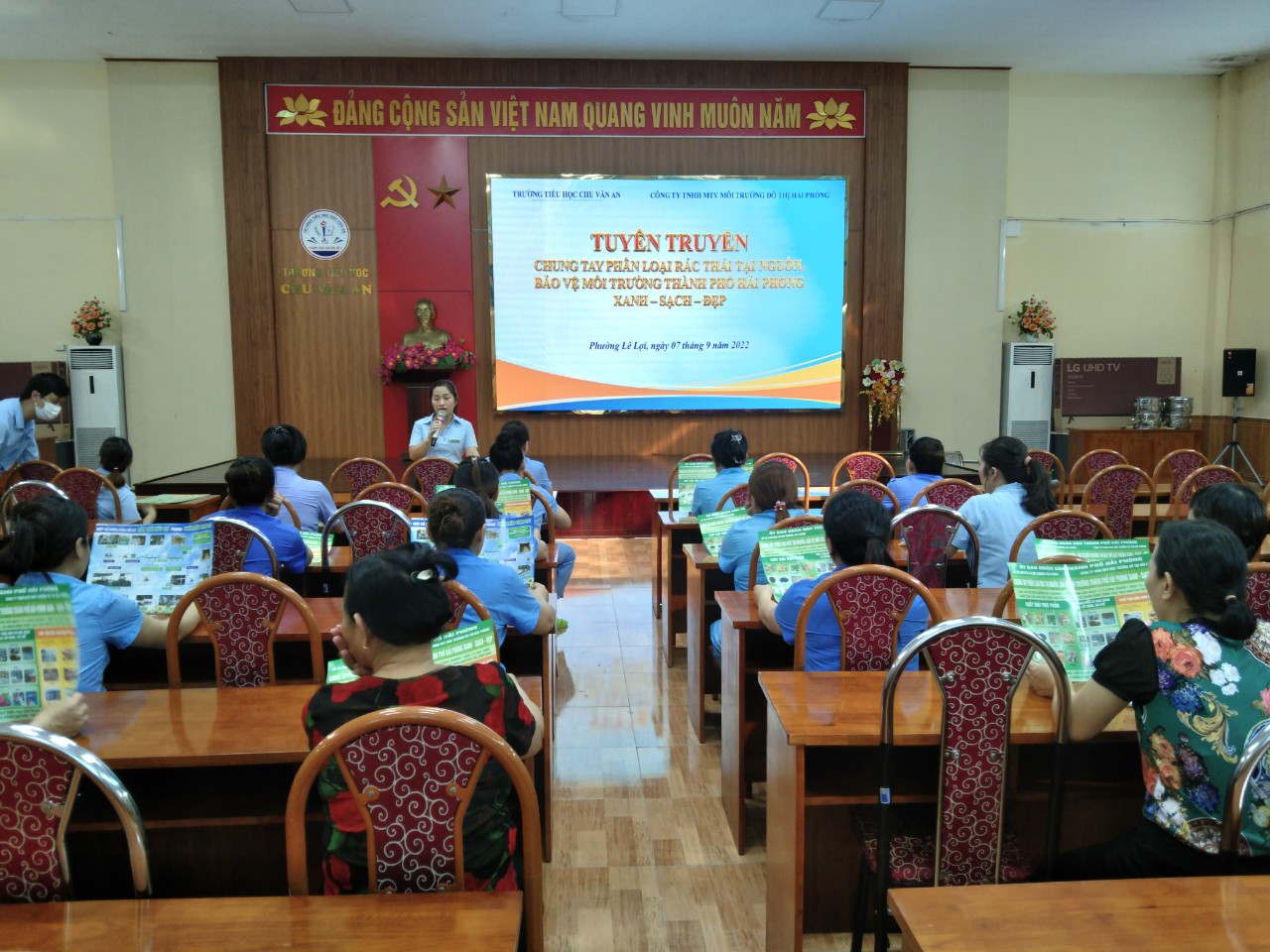 Tại đây, các đồng chí trong Ban giám hiệu, cán bộ giáo viên, nhân viên chăm nuôi bán trú đã được đại diện Công ty TNHH MTV Môi trường đô thị Hải Phòng (Công ty Môi trường đô thị) tuyên truyền về tầm quan trọng của công tác giữ gìn vệ sinh môi trường đô thị; phổ biến, hướng dẫn cụ thể về việc đổ rác đúng giờ, đúng nơi quy định và đặc biệt là việc phân loại rác tại nguồn, thông qua nhiều tài liệu, hình ảnh.